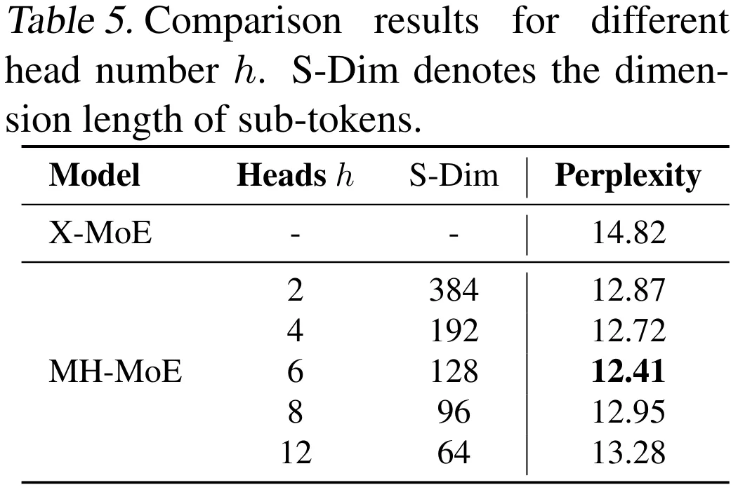 当专家数量增多时,MH-MoE 的困惑度会下降,这说明随着专家数量增多,其表征学习能力会提升,模型也能从中受益。