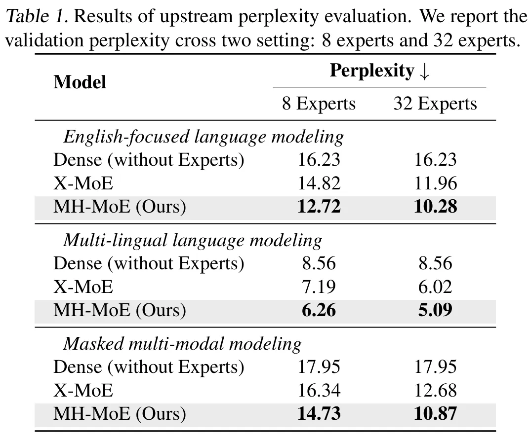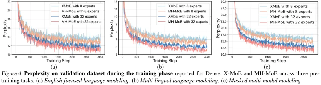 相比于基准,MH-MoE 的困惑度总是更低,这说明其能更有效地学习;