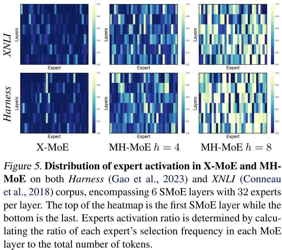 图 5 给出了 X-MoE 和 MH-MoE 中专家激活的分布情况。