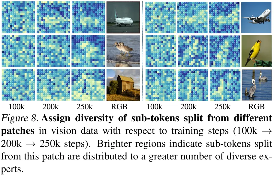 有趣的是,可以看到随着训练步骤增多,高频纹理区域(即有丰富语义信息的区域)的散度层级会逐渐增大,而低频纹理区域的散度层级则会逐渐降低。这表明在训练过程中,MH-MoE 倾向于将具有复杂纹理的区域的 token 路由到更多不同专家,由此可让模型对该区域的语义有更细粒度的理解。