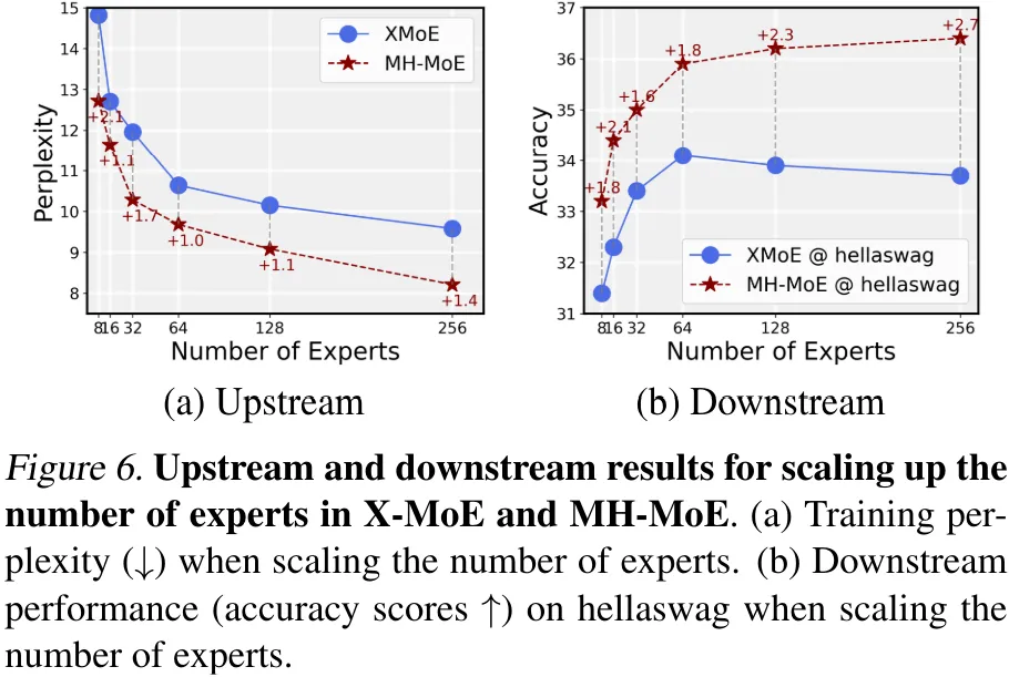 图 6 则对比了 X-MoE 和 MH-MoE 的可扩展性(专家数量从 8 扩展到 256)。