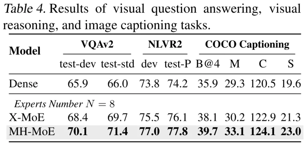 可以看到,MH-MoE 在这三个任务上有着全面的优势。这些结果表明 MH-MoE 具有更强的视觉信息理解能力,这也验证了新提出的多头机制在捕获视觉数据中的不同语义和详细信息方面的有效性。