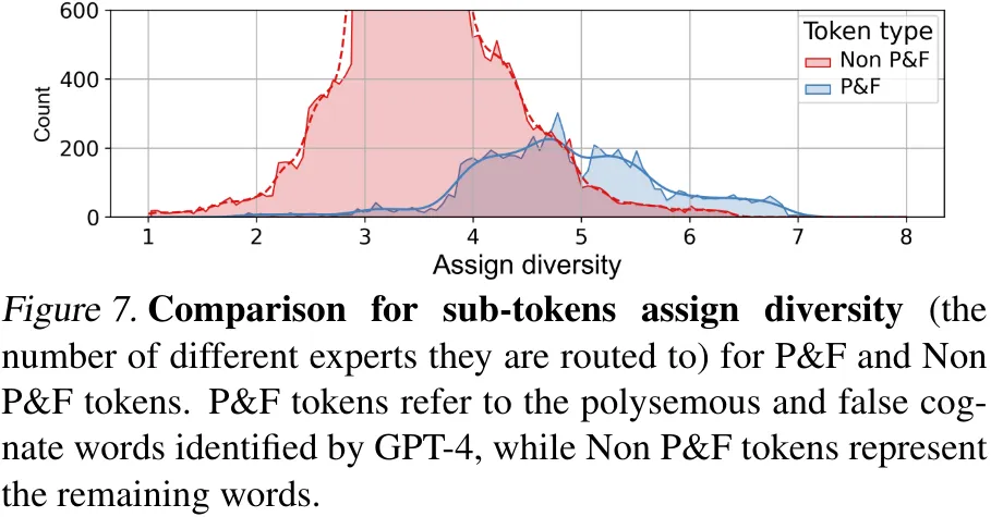 可以看到相比于非 PF token,PF token 的散度分布明显靠右。这说明,在 MH-MoE 的推理过程中,PF token 会将其子 token 路由到更多不同专家,从而会捕获到与非 PF token 不同的语义信息,实现更好的多义词和错误同源词建模。