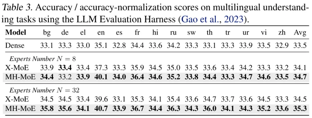 MH-MoE 依然表现最佳,这体现了多头机制在建模跨语言自然语言方面的有效性。