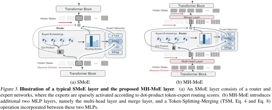 图 3 给出了 MH-MoE 的整体架构,其使用了多头机制将每个 token 分拆为子 token,然后将这些子 token 路由给不同的专家。