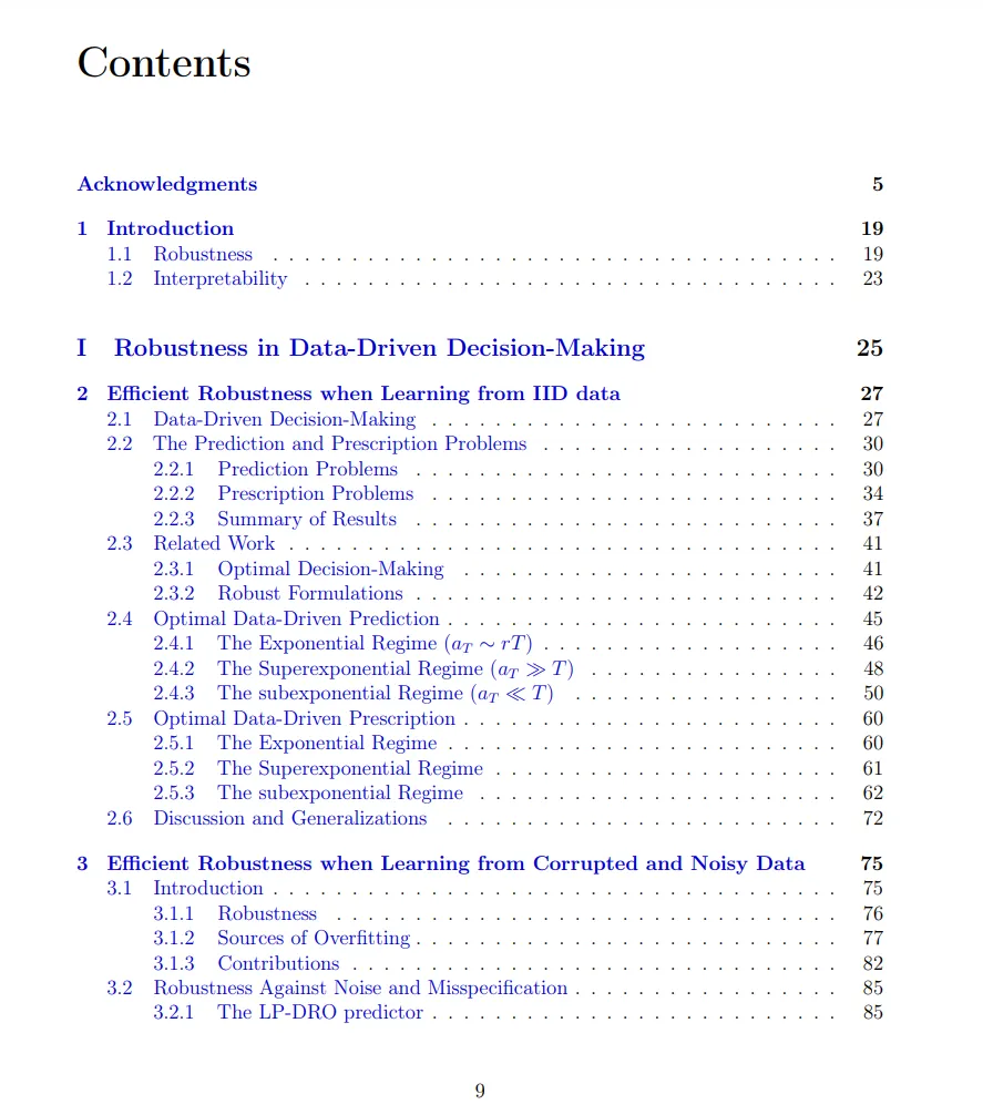 本论文的第一部分侧重于鲁棒性,即保证算法在各种数据不确定性下仍能提供稳定和可预测的性能。我们研究了在不同数据不确定性来源下的学习鲁棒性,包括基本的统计误差以及数据噪声和损坏。我们的研究揭示了这些不同来源如何相互作用并对数据驱动决策产生影响。我们引入了针对特定不确定性来源量身定制的新颖的分布鲁棒优化方法。我们的研究结果表明,对一种来源的保护可能会增加对另一种来源的脆弱性。为了解决这个问题,我们开发了分布模糊集,能够同时提供对所有来源的整体鲁棒性。在每种情况下,我们证明了我们的新方法实现了“高效”的鲁棒性,在平均性能与样本外保证之间实现了最佳平衡。我们的新算法被应用于各种场景,包括训练鲁棒神经网络,在这些场景中显著优于现有基准。