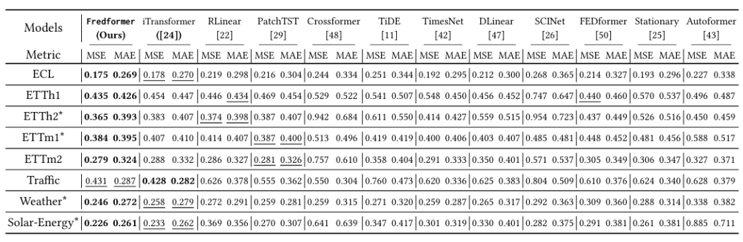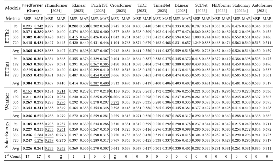研究者为了验证 Fredformer 模型的有效性,设计了一系列的实验。研究者选择了八个真实世界的时间序列数据集,包括天气、电力变压器温度(ETT)、电力消耗、交通和太阳能等数据。