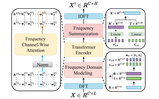 使用离散傅里叶变换(DFT)将输入时间序列分解为频率成分,并通过逆离散傅里叶变换(IDFT)重构预测结果。