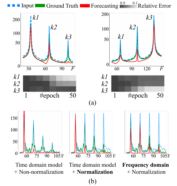 问题定义:研究者进行了实证研究,以调查这种偏差是如何被引入到时间序列预测 Transformer 中的。文中观察到,主要原因是关键频率成分之间的比例差异。值得注意的是,这些关键成分在预测的历史数据和真实数据中应该是一致的。此外,研究者还调查了影响去偏的目标和关键设计。