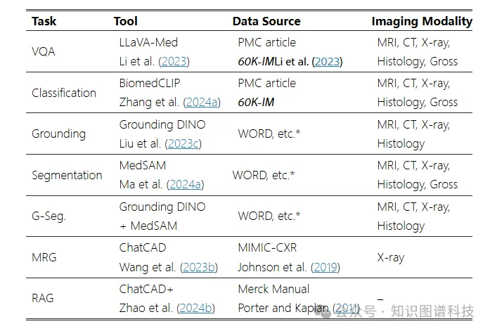 我们的 MMedAgent 能够访问各种工具,并具有处理各种任务的可扩展性。如表所示,我们集成了六种工具,涵盖了医学领域的七项代表性任务,即 (1) 接地,(2) 带边界框提示的分割(B-Seg),(3) 带文本提示的分割 (G-Seg),(4) 医学成像分类,(5) 医疗报告生成 (MRG),(6) 检索增强生成 (RAG),以及 (7) VQA。请注意,VQA 任务不需要额外的工具,因为我们使用最初支持该任务的 LLaVA-Med 作为主干。每个工具都充当专家,在各种医学成像模式中执行特定任务方面表现出非凡的熟练程度。