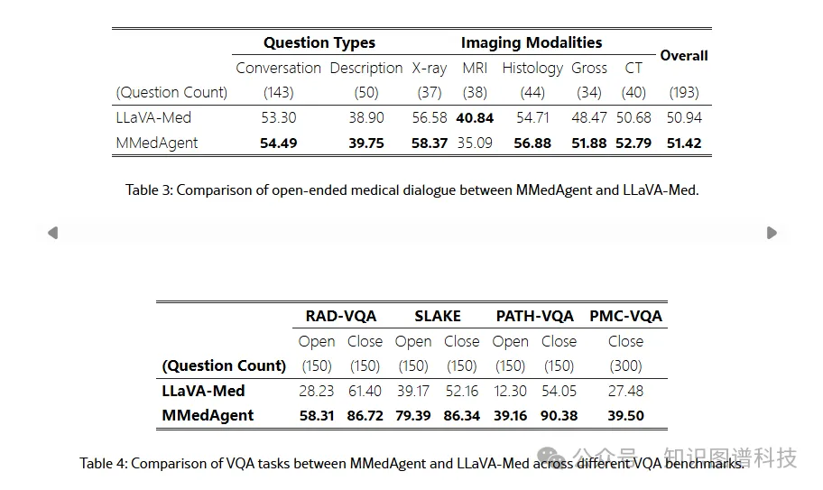 如 表3所示,从问题类型(对话和描述)和图像模态(X 射线、MRI、组织学、大体和 CT)的角度评估性能。在对工具学习数据集进行指令调整后,MMedAgent 在这两种类型的问题上都表现得更好。此外,MMedAgent 在除 MRI 之外的所有领域都优于 LLaVA-Med,证明了 MMedAgent 在开放式医学对话中的效率。