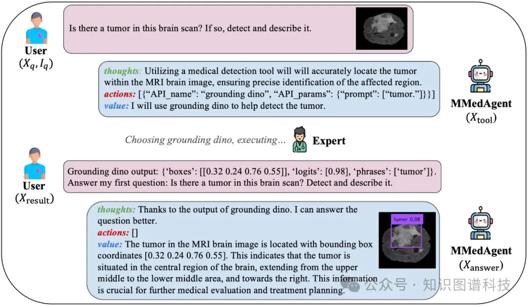 图 1:四步 MMedAgent 管道。图 2:MMedAgent 的训练数据示例,该示例学习使用 Grounding DINO 工具进行对象检测并回答用户的问题。3.2 指令微调