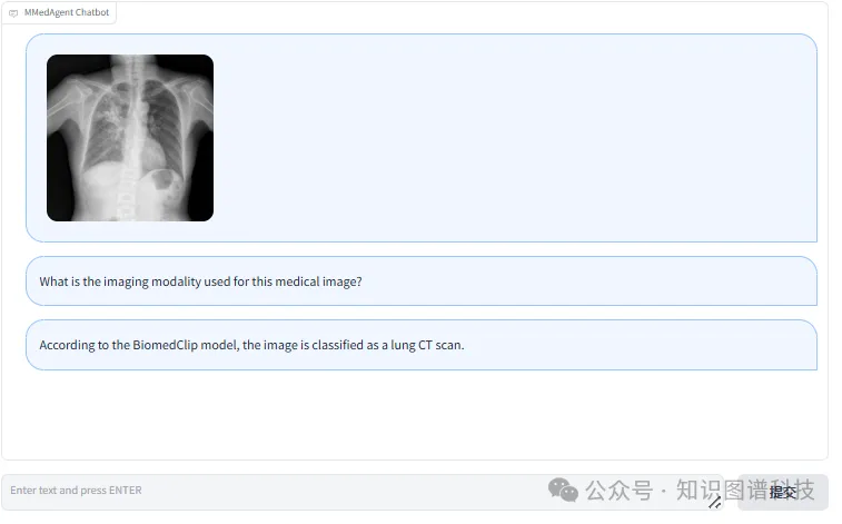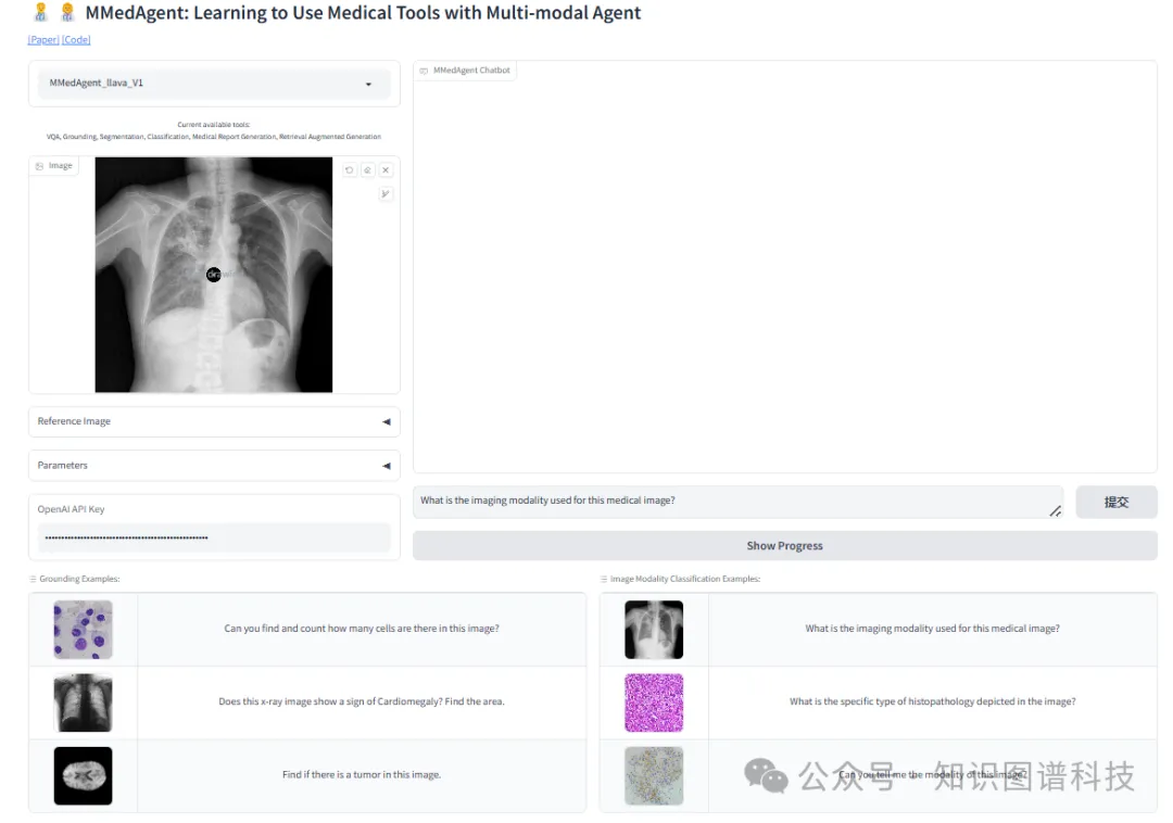 MRG 涉及根据提供的医疗信息或成像创建准确和真实的医疗报告。MMedAgent 结合了 ChatCAD ,一种开源工具,旨在为胸部 X 光图像生成医疗报告。该模型在 MIMIC-CXR 数据集上进行训练,可以提供包含详细放射学分析的报告,识别与胸部相关的疾病,例如心脏扩大、水肿、实变、肺不张等。