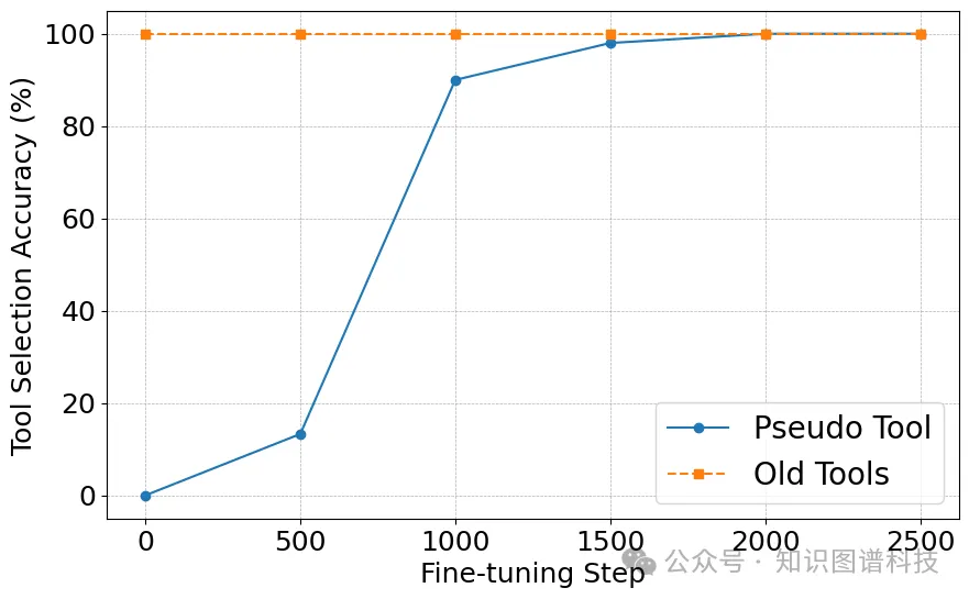 MMedAgent 的一个意义是它能够适应新工具。在这里,我们考虑两种情况。首先,当 MMedAgent 已经具备处理任务的高级工具可用时,过时工具的 API 名称可以无缝替换为新工具的 API 名称,无需额外的重新训练。其次,要将 MMedAgent 扩展到新任务,只需为此特定任务生成一小组指令调整数据并相应地微调代理,而不是从头开始重新训练它就足够了。为了验证这种能力,我们模拟了一个名为 “伪工具” 的新工具,生成了一个额外的 5K 指令调整数据(在第 5.1.1 节之后),并创建了 30 个看不见的不同问题来评估。我们利用相同的训练设置在一个 80G A100 GPU 上以较小的学习率 1e-6 和批量大小 10 微调 MMedAgent 。如图4所示,在 2K 步长内选择新刀具的准确率提高到 100%,而不会损害选择旧刀具的性能。