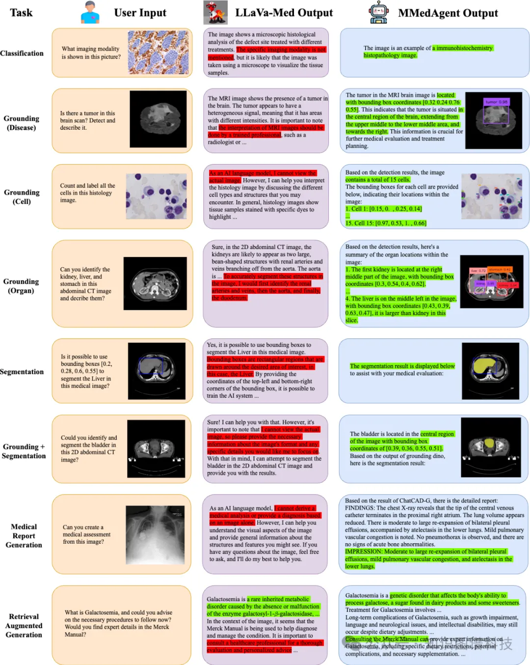 图 3:LLaVA-Med 和 MMedAgent 在不同任务中的定性比较。不需要的响应和所需的响应分别以红色和绿色突出显示。