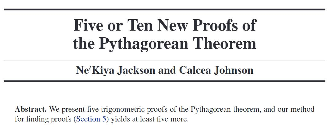 故事要从 2022 年讲起,那年美国高中生 Ne’Kiya Jackson 和 Calcea Johnson 在回答数学竞赛的一道加分题时,发现了一种证明几千年历史勾股定理的新方法,令老师们赞叹不已。这仅仅是个开始。
