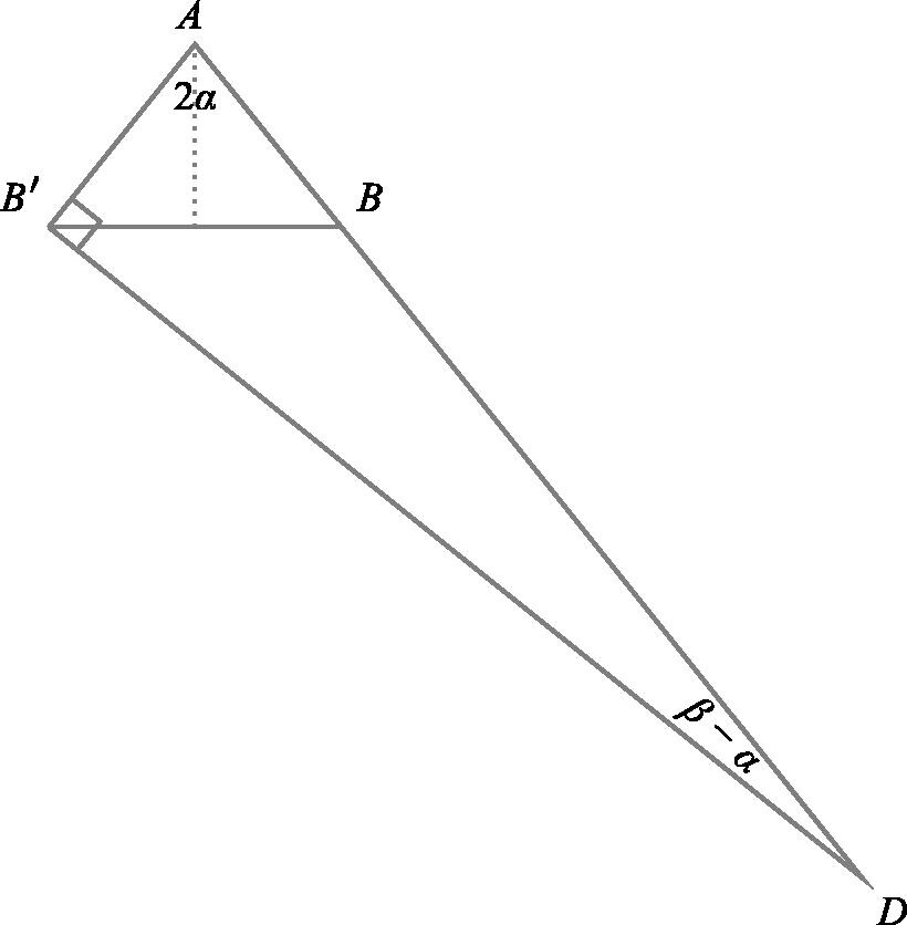 这会得到一个等腰三角形𝐴𝐵𝐵′,其角度分别为 2𝛼、𝛽 和 𝛽;下一步是取其中的 𝛽 角,并将其转换为 𝛽 – 𝛼 或 90 度。
