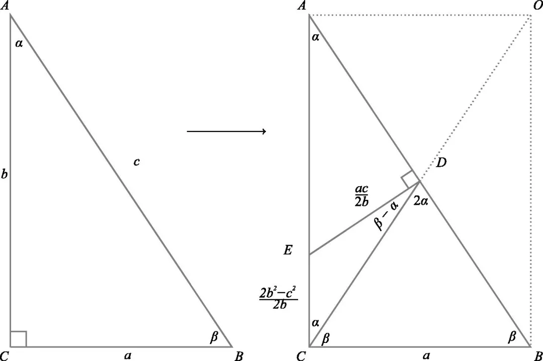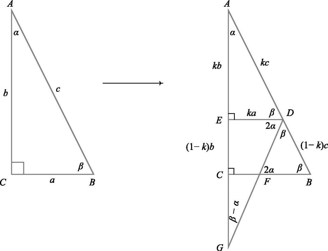 给定直角三角形 ABC,且有 𝛼≤𝛽,对于任意常数 𝑘(0<𝑘<1),可以画出一条线 DE 并使得 △𝐴𝐵𝐶∼△𝐴𝐷𝐸 具有比例因子 k。然后再画一条线 DF,使得 ∠𝐸𝐷𝐹=2𝛼。然后选择一个适当的 k 值,使得 F 位于 B 和 C 之间。