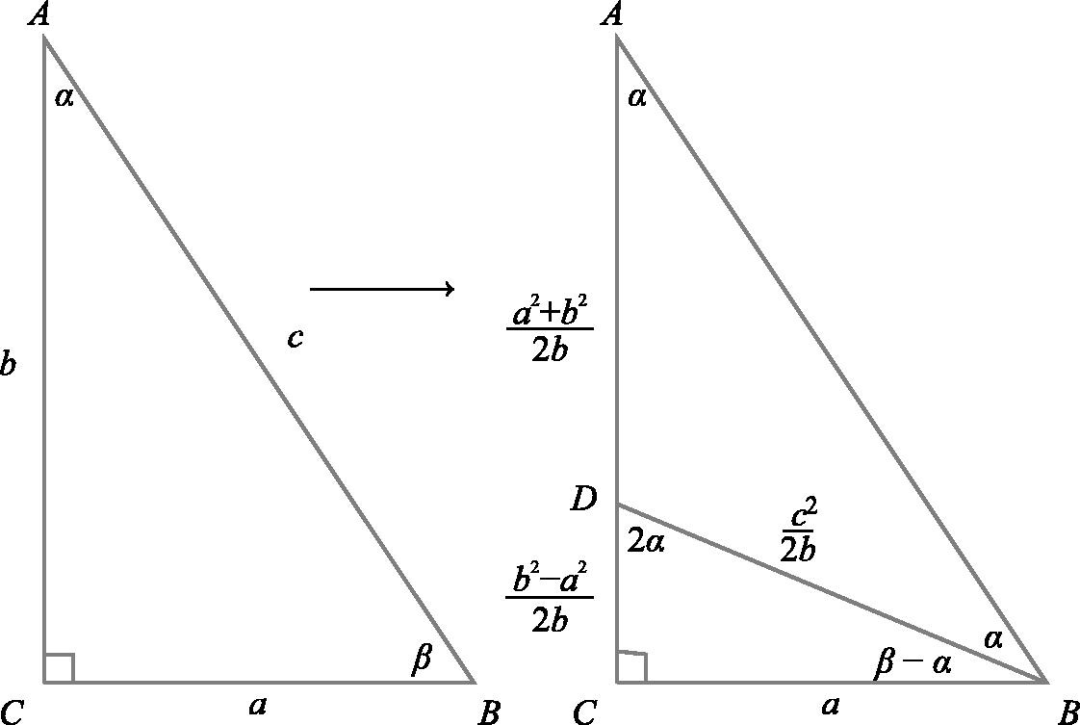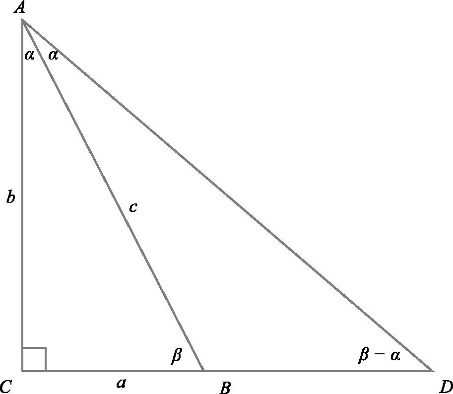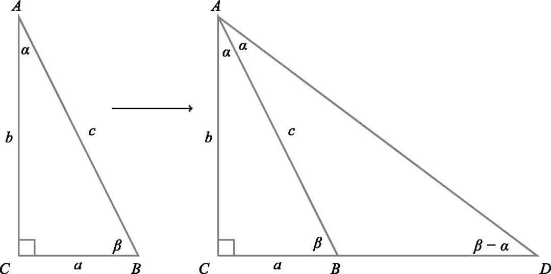 给定直角三角形 ABC,如下图所示,沿边 BC 找到一个点 D,使得 ∠𝐵𝐴𝐷=𝛼。这样一来,∠𝐴𝐷𝐶=90−2𝛼=𝛽−𝛼。