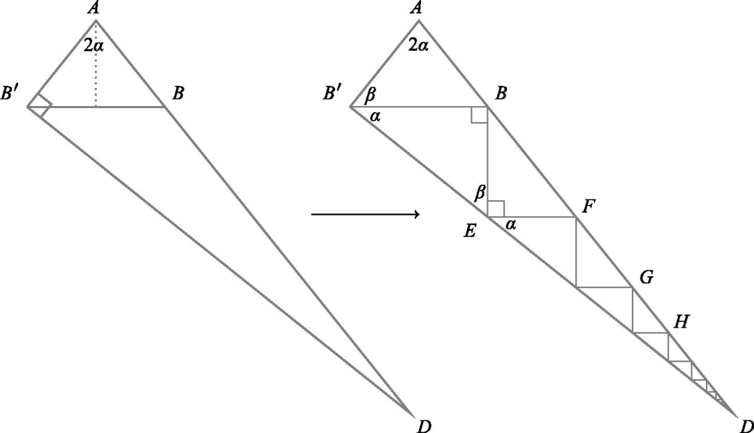 现在,如图 8 所示,基于 𝐴𝐵𝐵′ 构建一个直角三角形 𝐴𝐵′𝐷,其中直角在 𝐵′ 处。然后在 △𝐵′𝐵𝐷 中填充逐步变小的 △𝐴𝐵𝐶 的相似三角形。
