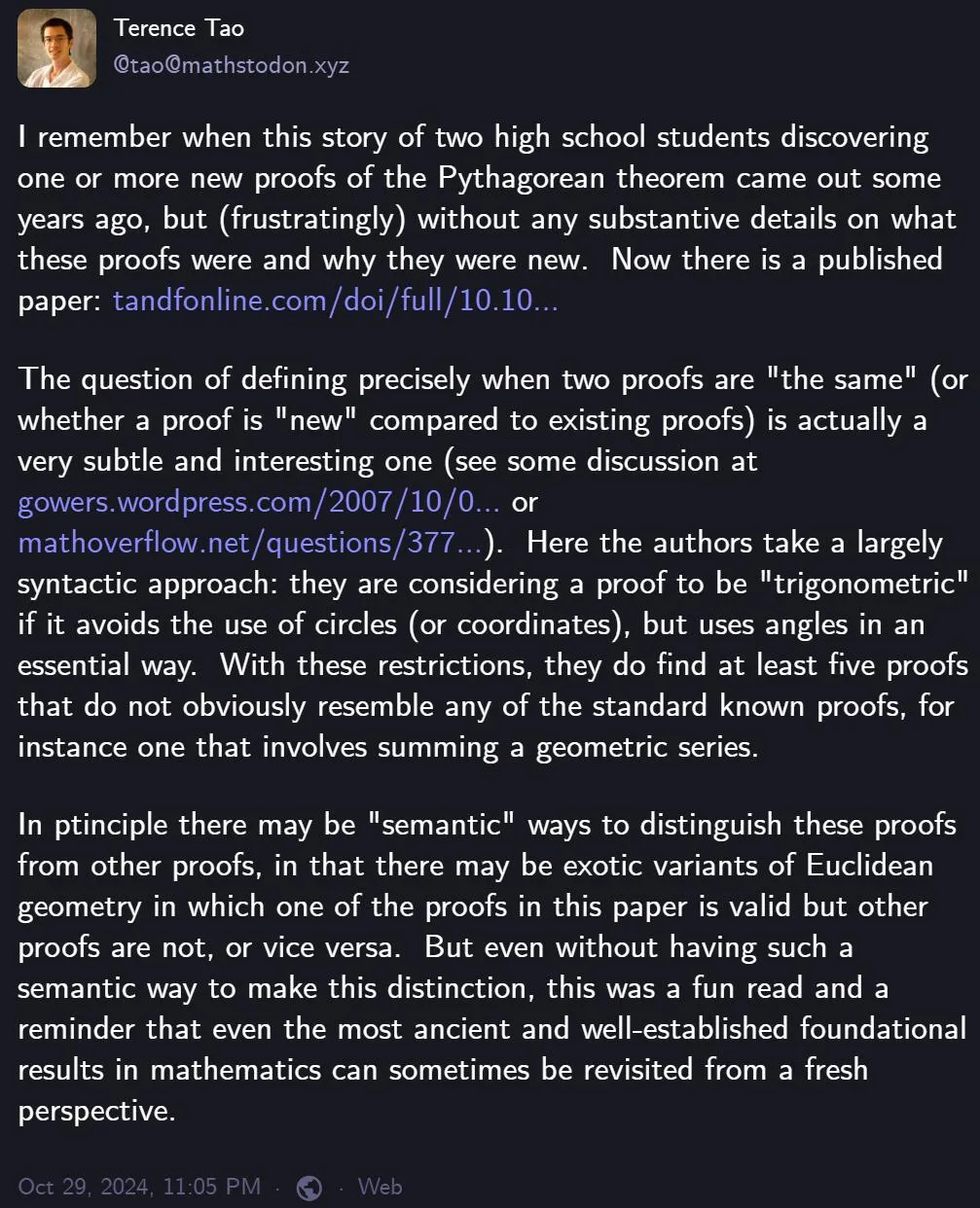 陶哲轩表示,这是一篇有趣的论文,在简单探讨了两种证明是否算是同一种证明的话题之后,他提醒我们:即使是最古老和最完善的数学基础知识,有时也可以从新的角度重新审视。