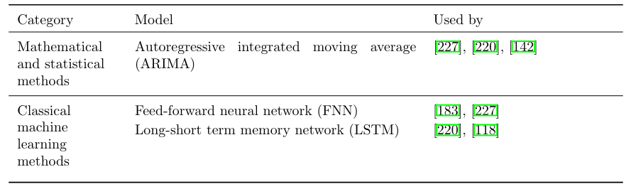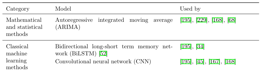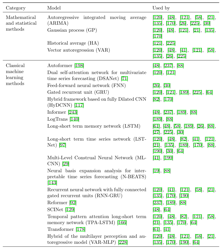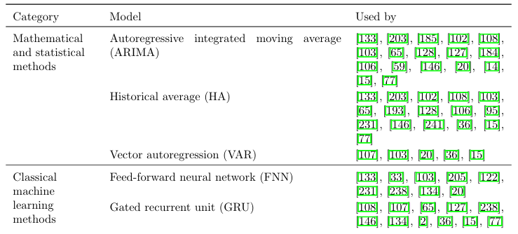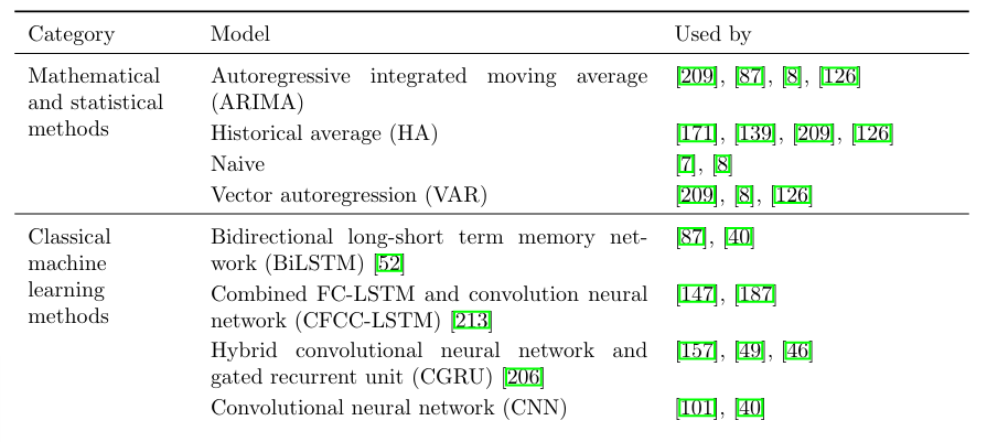 通过查询确定出的论文数量最多的主题(在156篇中占39篇)是“移动性”,它关注的是人的移动。这一主题包括城市交通、航空旅行和自行车需求等应用。鉴于该组文章数量众多,因此可以对基准、模型和结果进行更详细的比较。
