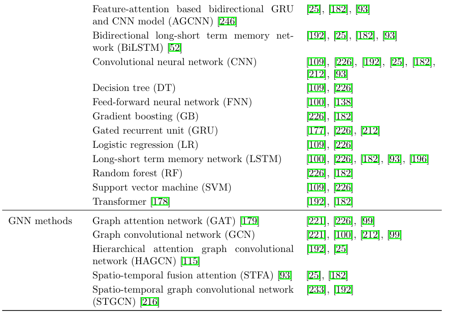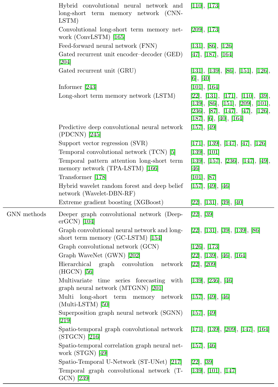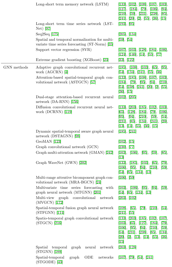 大多数论文提出了基于卷积GNN的模型,也有部分使用了注意力GNN和混合架构。图结构的定义在论文中描述不一,有些基于空间距离,有些基于时间序列的相关性或相似性。