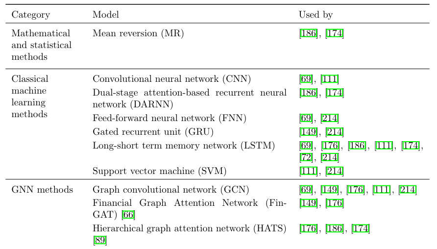 在提出的GNN模型中,有一半使用注意力机制,另一半使用卷积GNN。这些模型通常基于公司和股票之间的关系预定义图结构,或者让模型自己学习图结构。