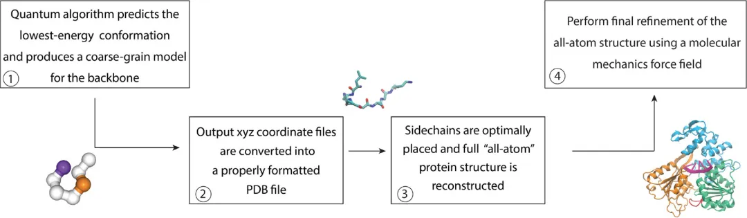 研究人员首先利用量子算法来模拟片段主链的最低能量构象,这通常是计算过程中计算量最大的步骤。然后使用经典方法转换从量子计算机获得的结果,重建蛋白质及其侧链,并使用经典分子力学力场对结构进行最终细化。