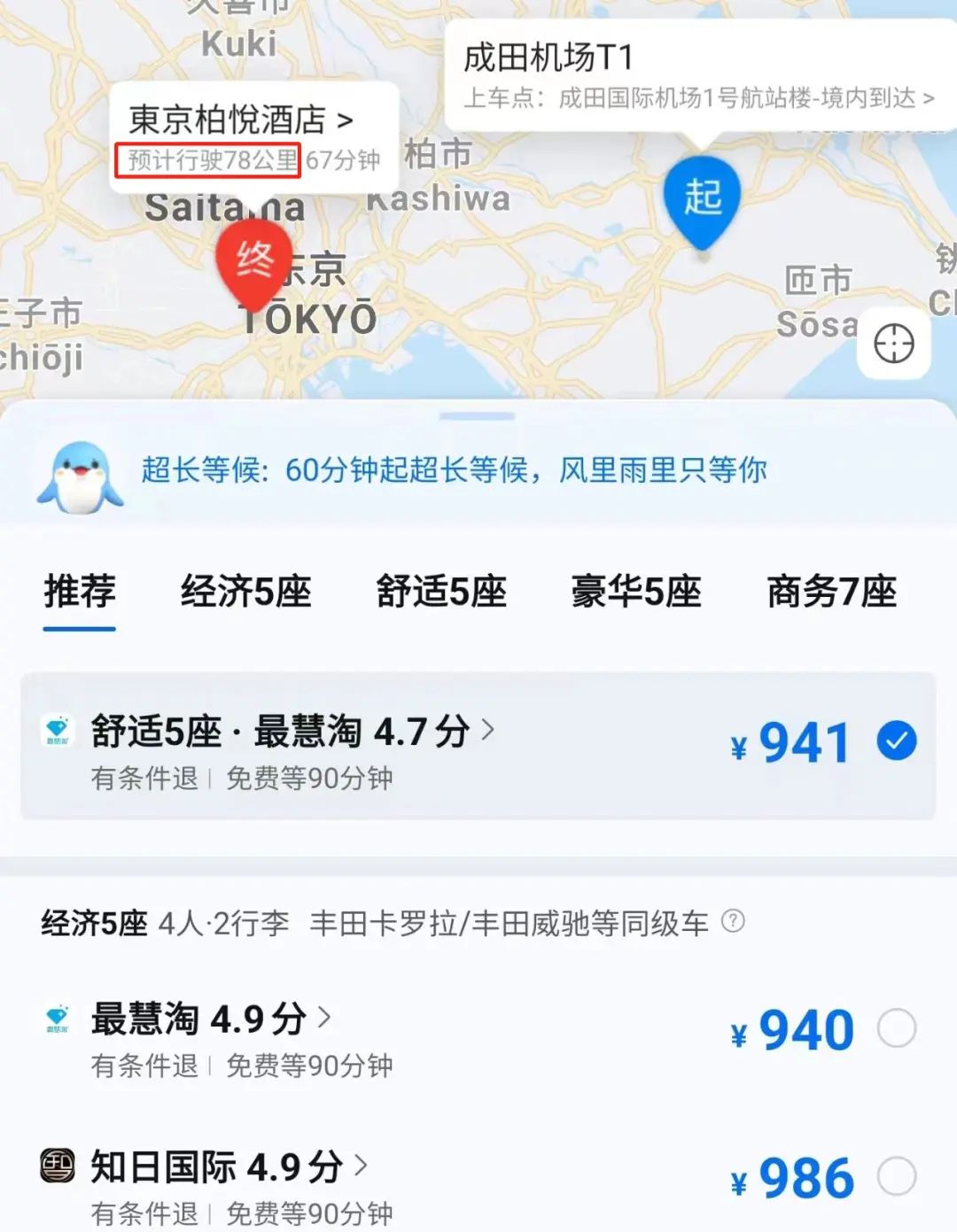 如果不在以上地区,很显然境外接送机更适合。境外接送机权益用得好,分分钟价值千元。例如东京成田国际机场到东京柏悦酒店,全程差不多78公里,在某程上预订这趟接机行程,差不多要900元+。而汇丰的这项权益,在东京是可以免费享受80公里接送机的,所以往返接送一次,就省了将近2000元。
