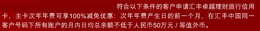 ● 免次年年费:次年年费产生日的前一个月,在汇丰月内日均总余额不低于人民币50万元 /等值。
