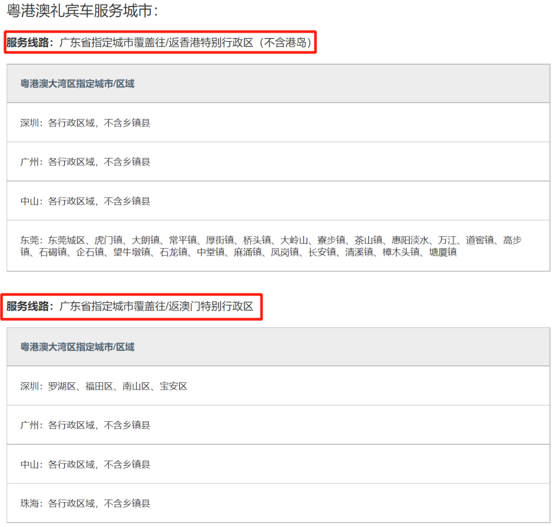 先说粤港澳跨境礼宾车,如果你在广州、深圳、中山、东莞,可以直接坐礼宾车到香港;而在广州、深圳、中山、珠海,则可以直接坐礼宾车到澳门。2次权益,刚好可以往返一次。