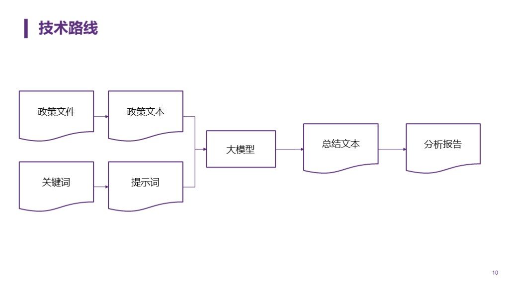 这是我们技术路线,主要是先把政策文件转化为政策文本,然后再提取出一些关键词,用这些关键词来设计对应的提示词,同时交给大模型生成总结文本以及后续的分析报告。在关键词基础上,我们先进行了PDF转文本,然后再在其中进行关键词提取,最后将所有的TXT整合成一个统一的文档,再进行每个关键词验证,最后经过专家的审核得到最终的关键词库。专家也会给一个关键词库,我们将这两个关键词库进行合并。