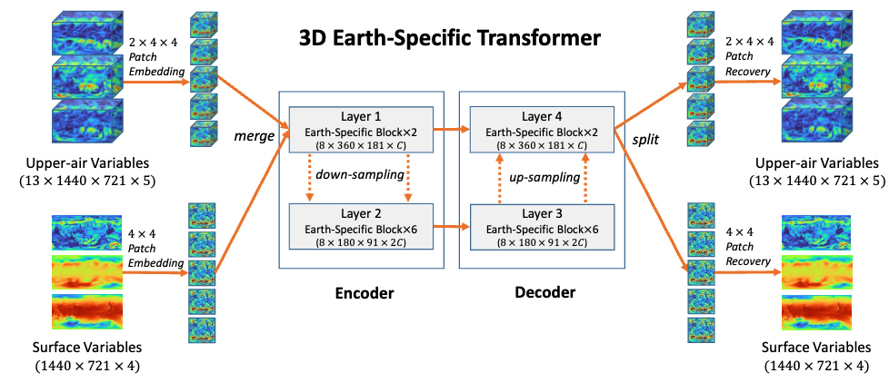 盘古气象大模型的输入输出均为三维的气象场。由于气象场的经纬度分布不均匀,盘古气象大模型使用了三维的 Vision Transformer (ViT) 对气象数据进行处理,精度首次超过了主流的综合预报系统 (IFS)。