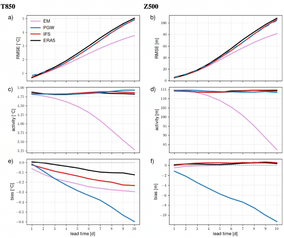 在欧洲中期天气预报中心的对比中,可以看到基于 AI 的天气预测,在部分性能上已经可以与数值天气预报媲美,将在未来发挥着重要作用。然而,这些模型尚没有综合预测能力,这是中长期尺度上提供有价值预测的关键。
