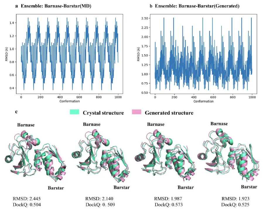该研究还从 AlphaPPImd 模型生成的 1,000 个 barnase-barstar 复合物构象中,选择了 4 个 RMSD 接近 2Å 的代表性构象。研究结果表明,AlphaPPImd 生成的蛋白质复合物构象模型与参考晶体结构更接近,准确度更高(均方根偏差 < 2Å)且可接受性更高(DockQ ≥ 0.23)。