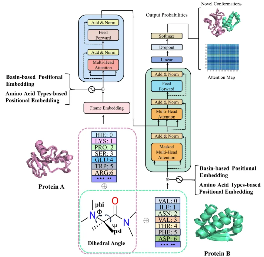 在完成分子动力学模拟后,研究团队基于 Transformer 构建了 AlphaPPIMd 模型,利用深度生成模型来捕捉传统分子动力学难以分析的蛋白质构象状态。AlphaPPImd 框架的核心是自注意力机制,可以从 MD 轨迹中捕获影响蛋白-蛋白复合物构象的关键氨基酸残基对。