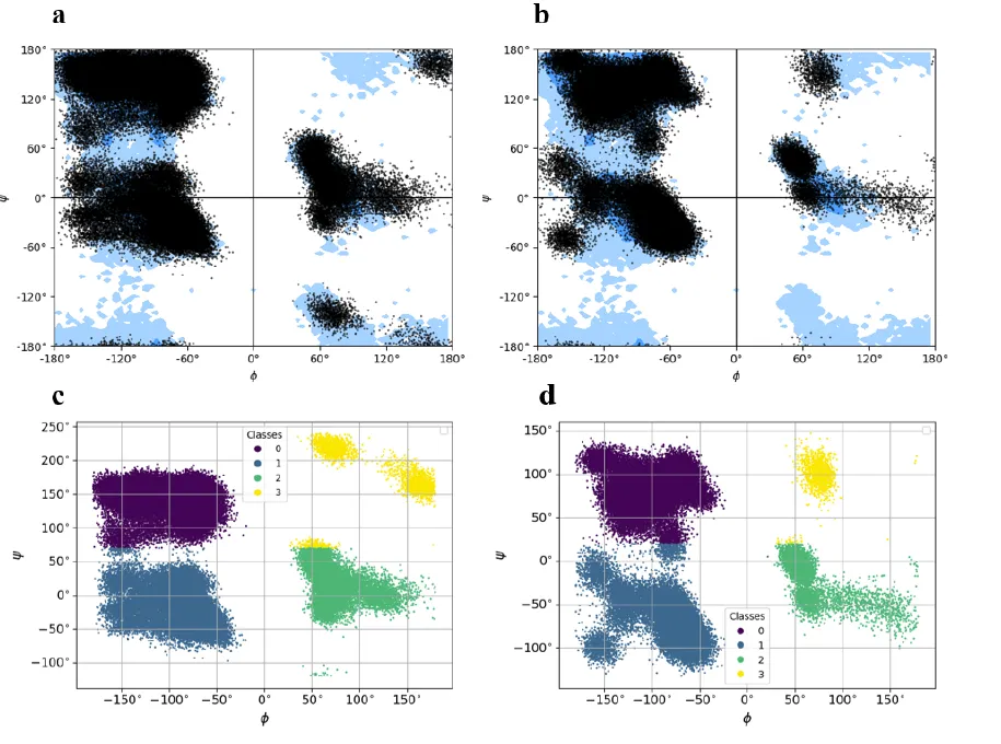 结果表明,该模型能够成功地对构象进行采样和展开,并且能够正确执行 Φ、Ψ 的二面体约束。