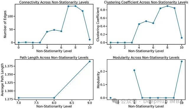 在最高的非平稳性水平(10级),连通性下降,这可能反映了由于强随机冲击和剧烈变化,片段在其特性上过于分散。