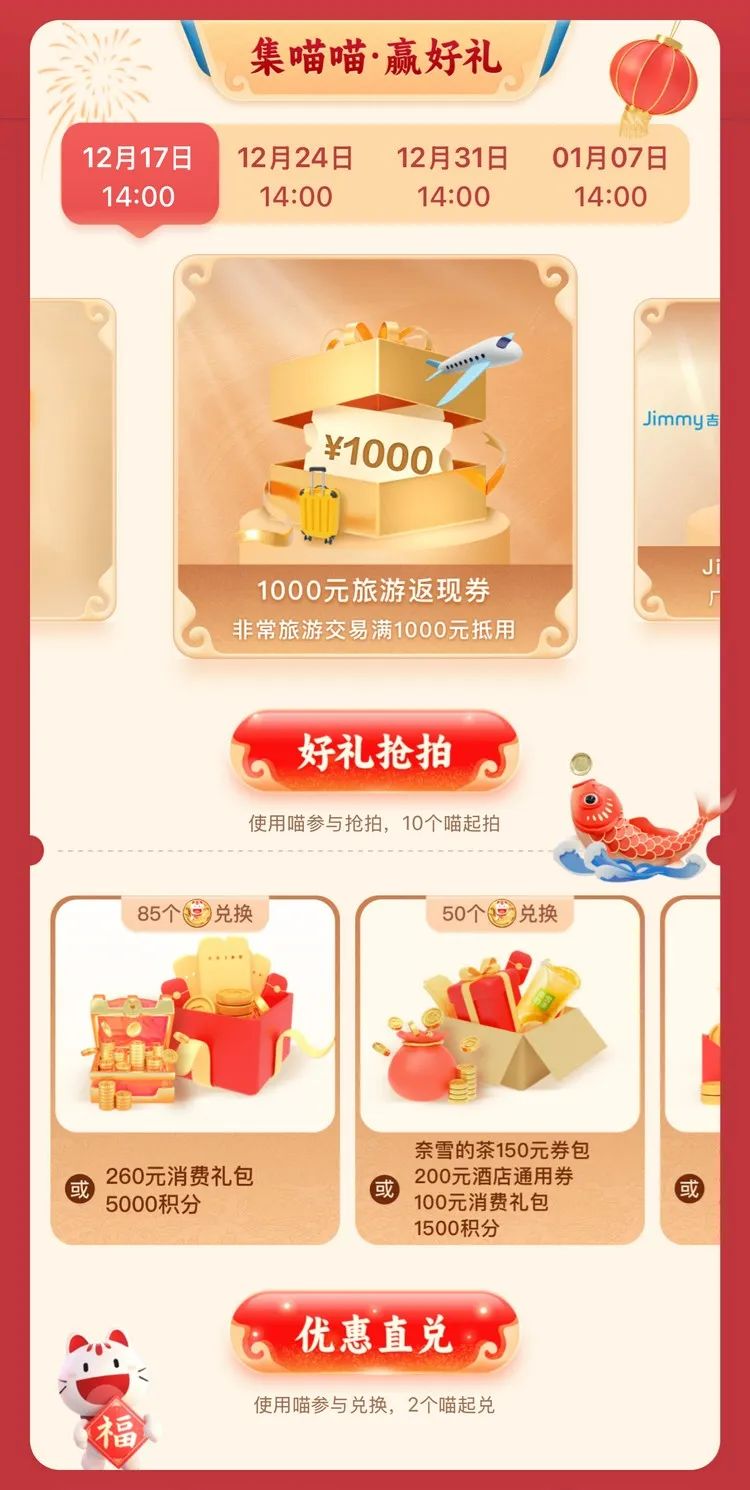 集齐的喵可以用于“限时拍好礼”或“优惠直兑”。限时拍好礼共有四轮,分别在12月17日、24日、31日和次年1月7日的14点开始,持续24小时。用户可用喵参与竞拍,价高者得。优惠直兑则可直接用固定数量的喵兑换礼品或优惠券,例如85只喵可兑换260元消费券或5000积分,50只喵可兑换奈雪的茶150元券包、200元酒店券或100元消费券等。