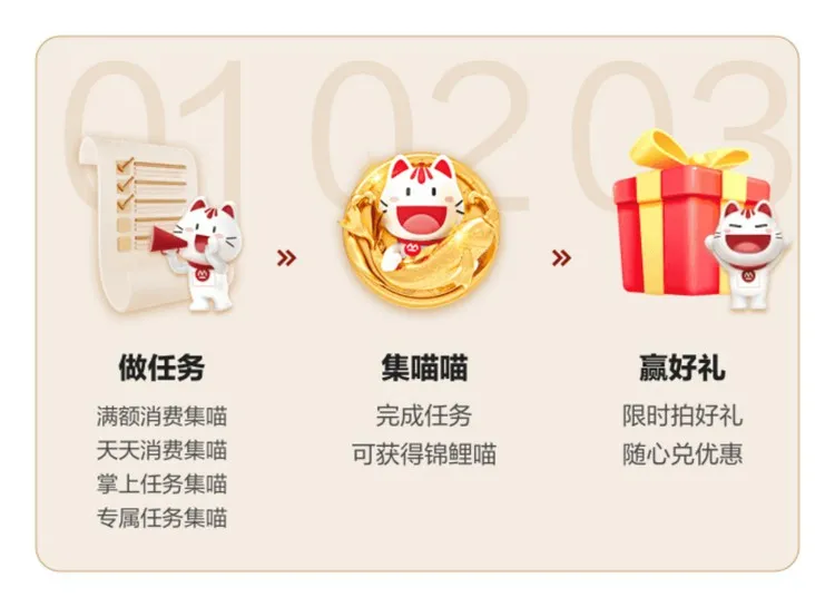 活动内容: 完成集喵任务得到锦鲤喵,通过使用锦鲤喵可参与限时拍好礼及随心兑优惠获取心仪好礼。