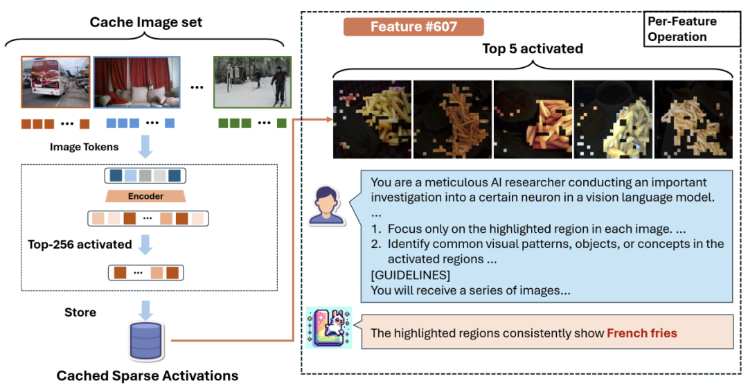 对于上一步当中 SAE 的每个神经元 z,获得训练集里面激活最大的 K 张图片,以及激活最大的图像区域,把这些图像给 LLaVA-OV-72B 找出共同点。