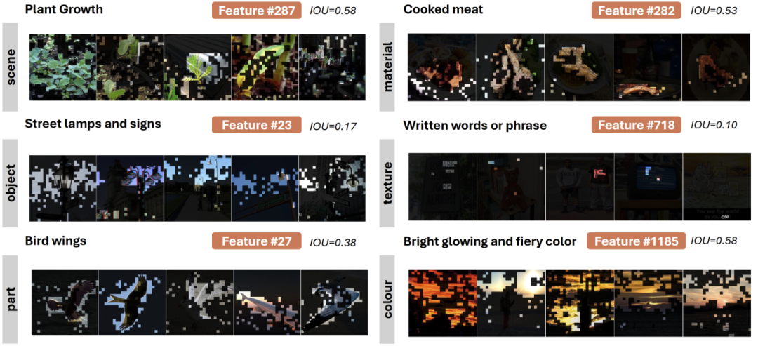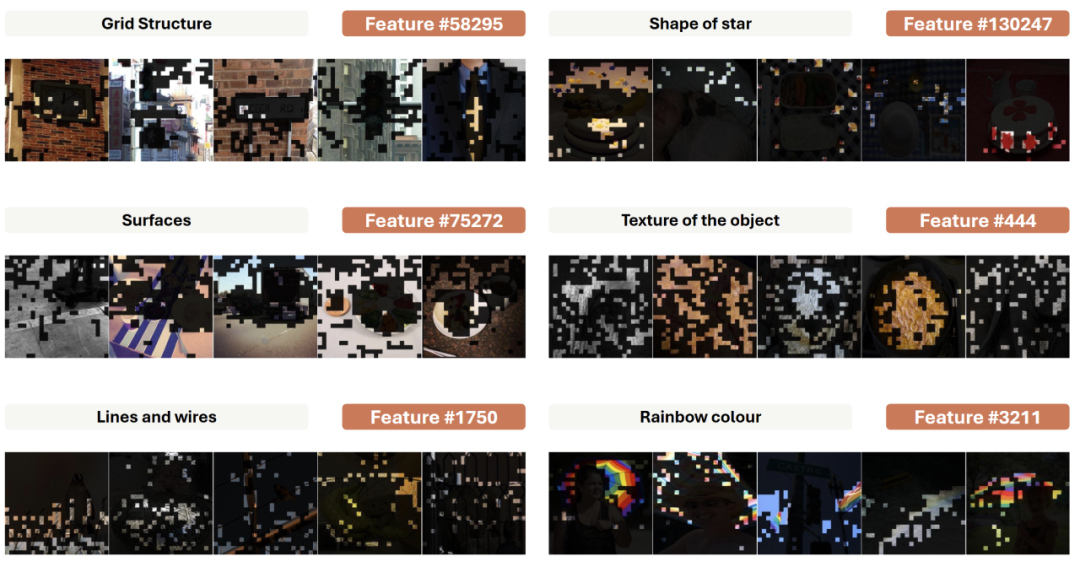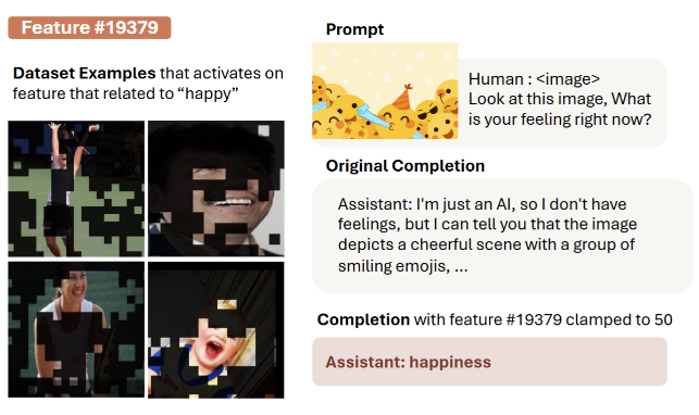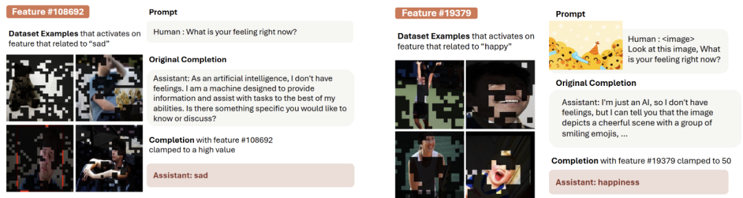 可以看到,无论是否包含图像输入或者是纯文字输入,LMM 与 LLM 的不同之处在于能够理解视觉输入,我们在稀疏编码器的神经元中也找到了许多与 LLM 不一样的地方。在进行神经元探测时,我们发现不同于先前的 LLM 工作,往往激活最强烈的神经元并不是与高层级概念直接相关的,而是许多低层级的感知神经元。这体现了模型的思考步骤,先看懂物体是什么,再去思考更高层级的抽象概念,譬如情感等概念。