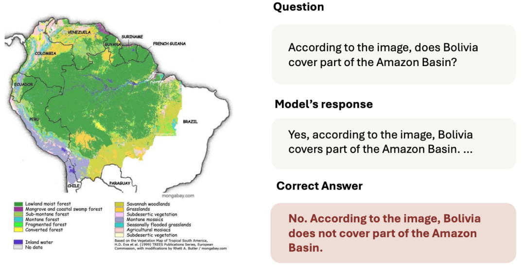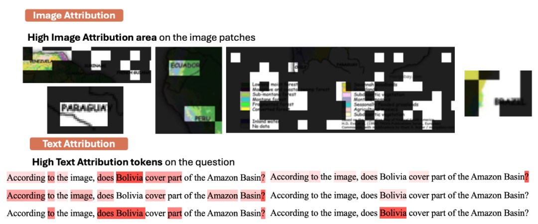 通过探究发现,造成模型输出 Yes 的罪魁祸首并不在图像的理解能力上,模型能够很好的找到需要关注的点,并准确的找到各个国家的名字。然而,在文字上面,我们发现模型过分的关注了 Bolivia 这一词,导致了最后的输出产生幻觉。通过这一探究,我们思考如何能够抑制这一幻觉现象并展开了实验。