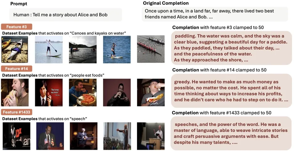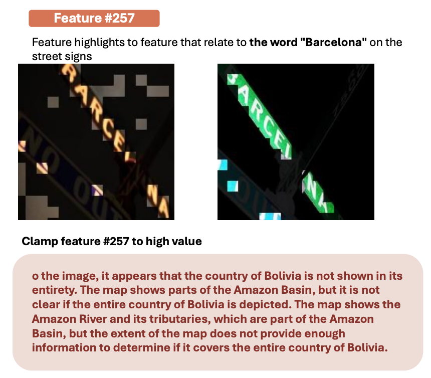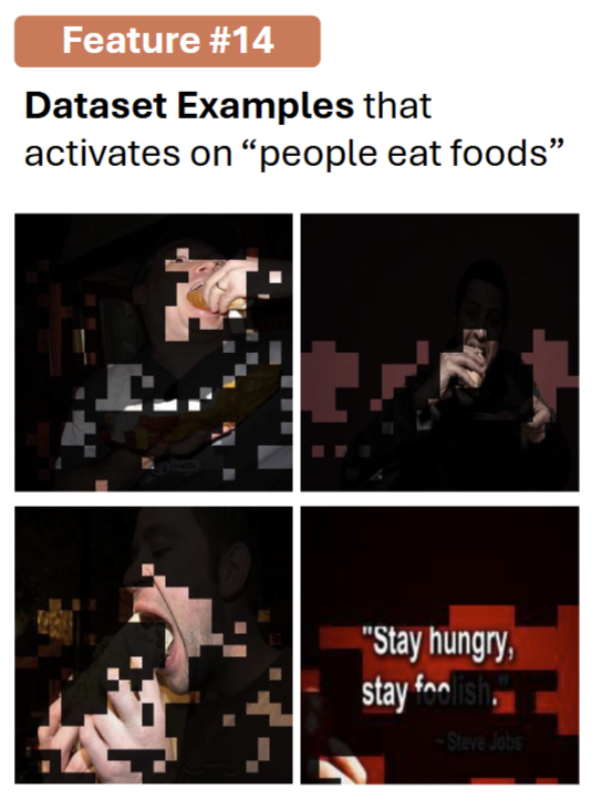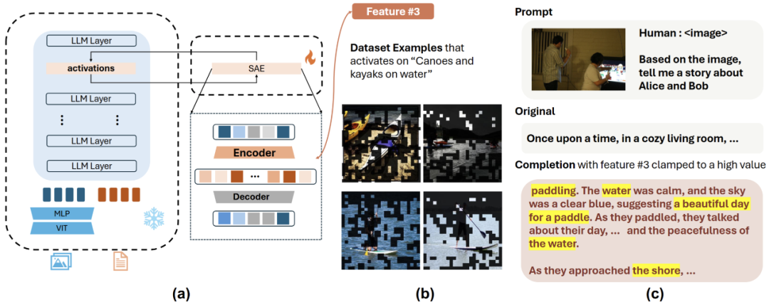 (a) 把 SAE 放在 Llava 的某一层并且在 Llava-NEXT 所有数据上训练;(b) 找到一个神经元的最大激活的图片和区域,让 Llava 找出公共点;(c) 刺激神经元可以改变模型行为