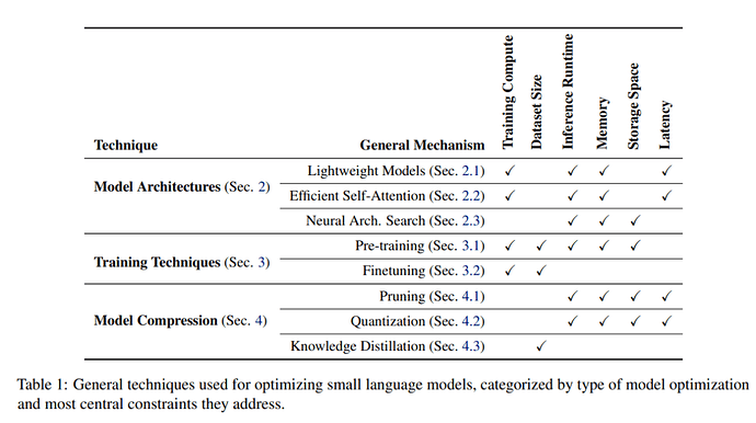 在小型语言模型的预处理(模型架构)、训练和后处理(模型压缩)中使用的技术