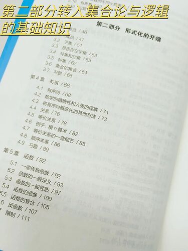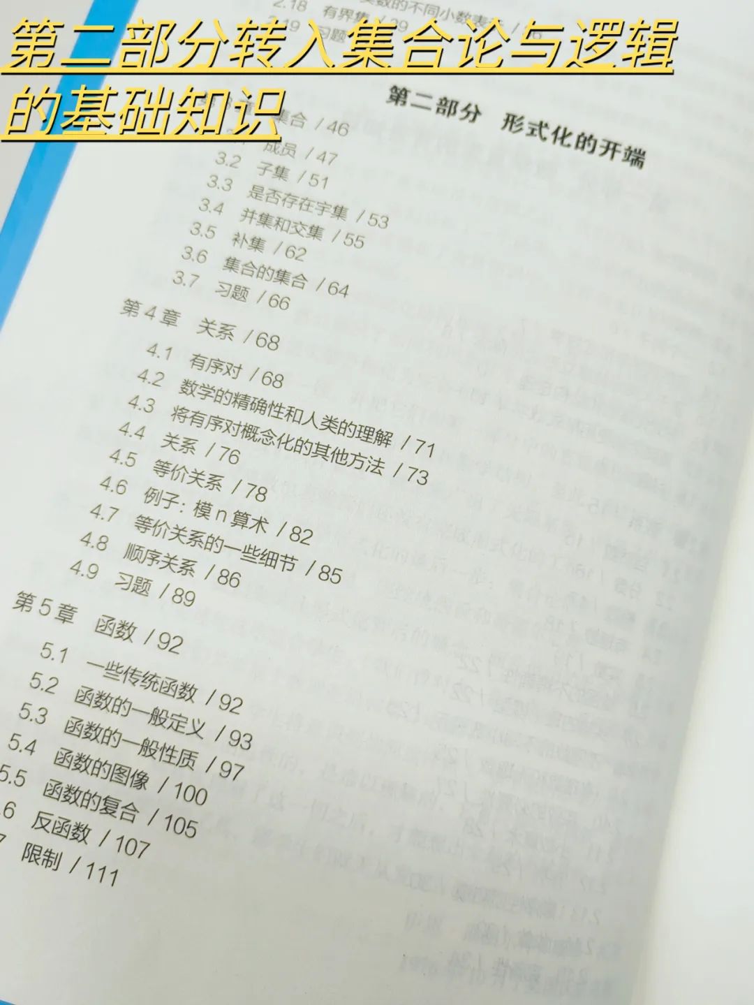 第二部分讲了集合、两种数学关系、函数、数理逻辑和数学证明,这部分开始介绍形式化的内容,是对基本思想的深入挖掘;