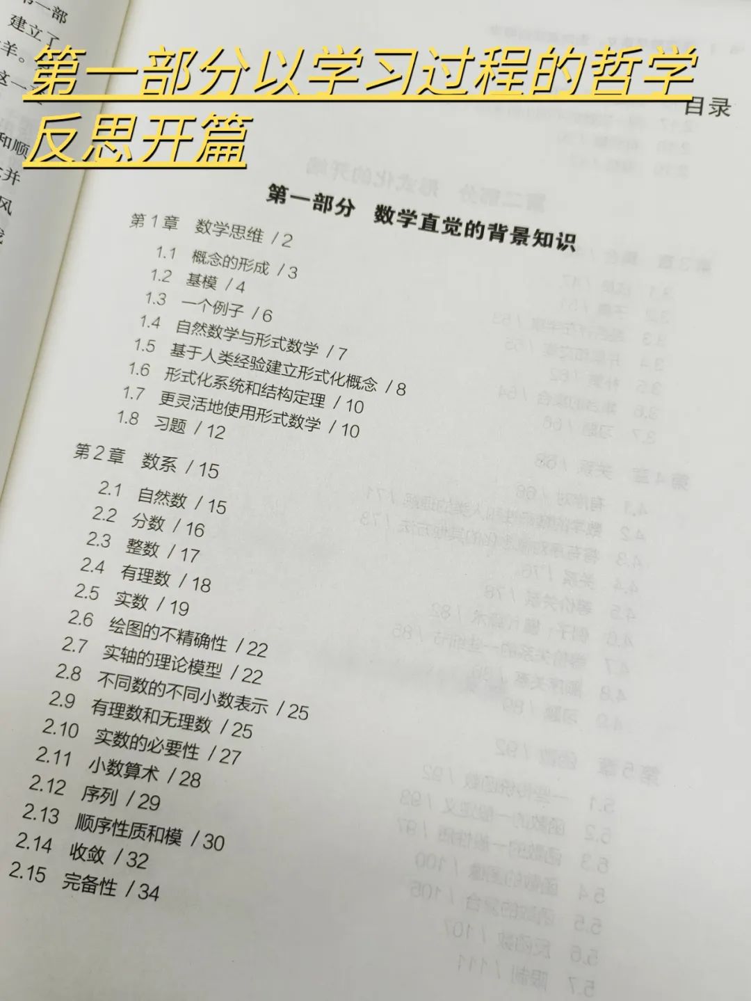 第一部分介绍数学思维和数系,这部分是中小学数学知识的回顾,也是数学直觉的背景知识;