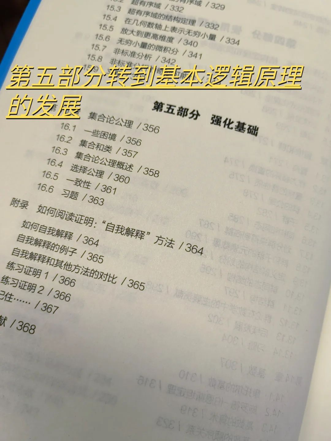 第五部分转到基本逻辑原理的发展,涉及集合论公理,是对数学基础的强化。