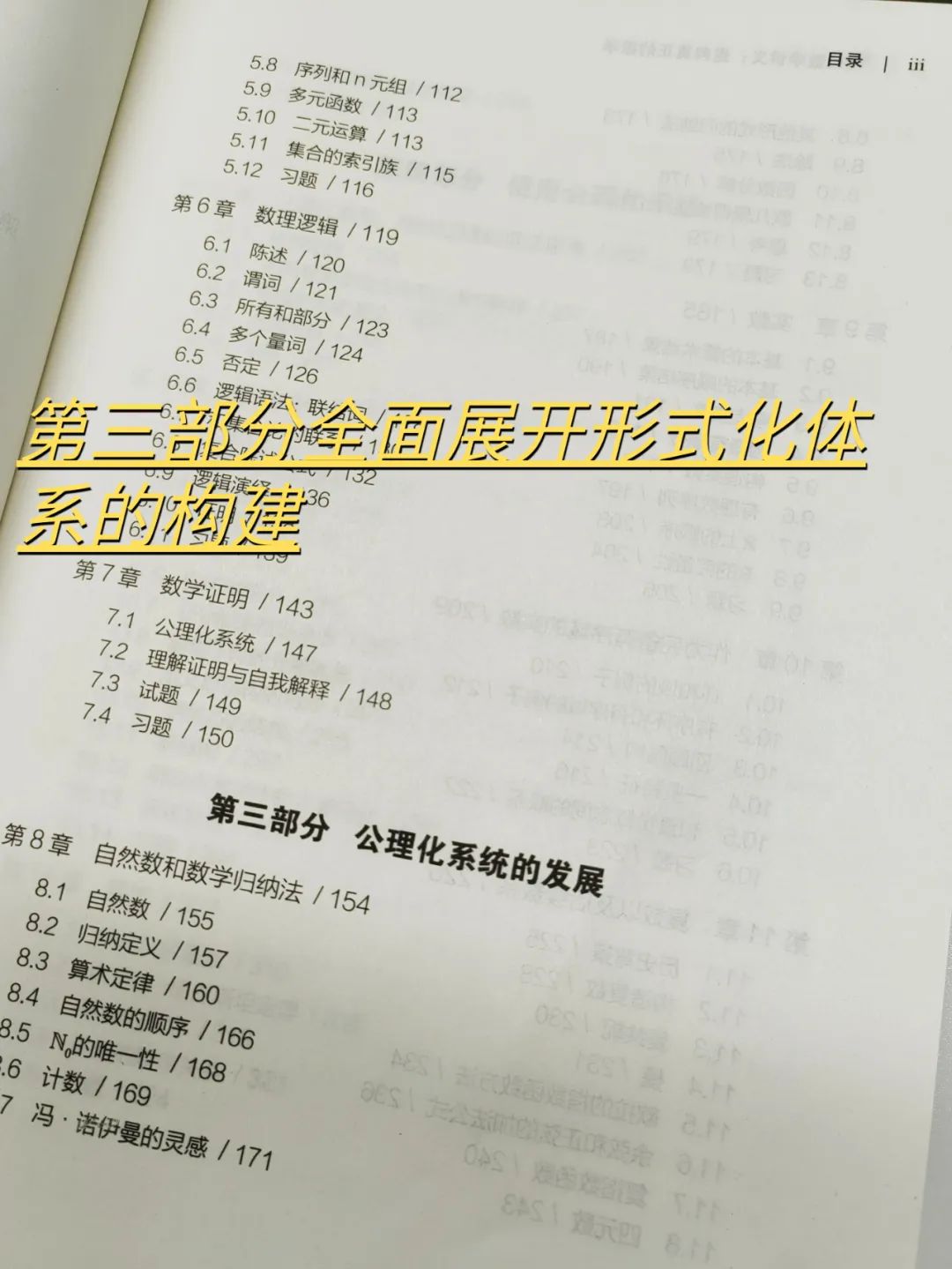 第三部分讲数学归纳法、实数构造、完备有序域等,介绍用基本数学思想构建数系的形式结构,聚焦公理化系统的发展;